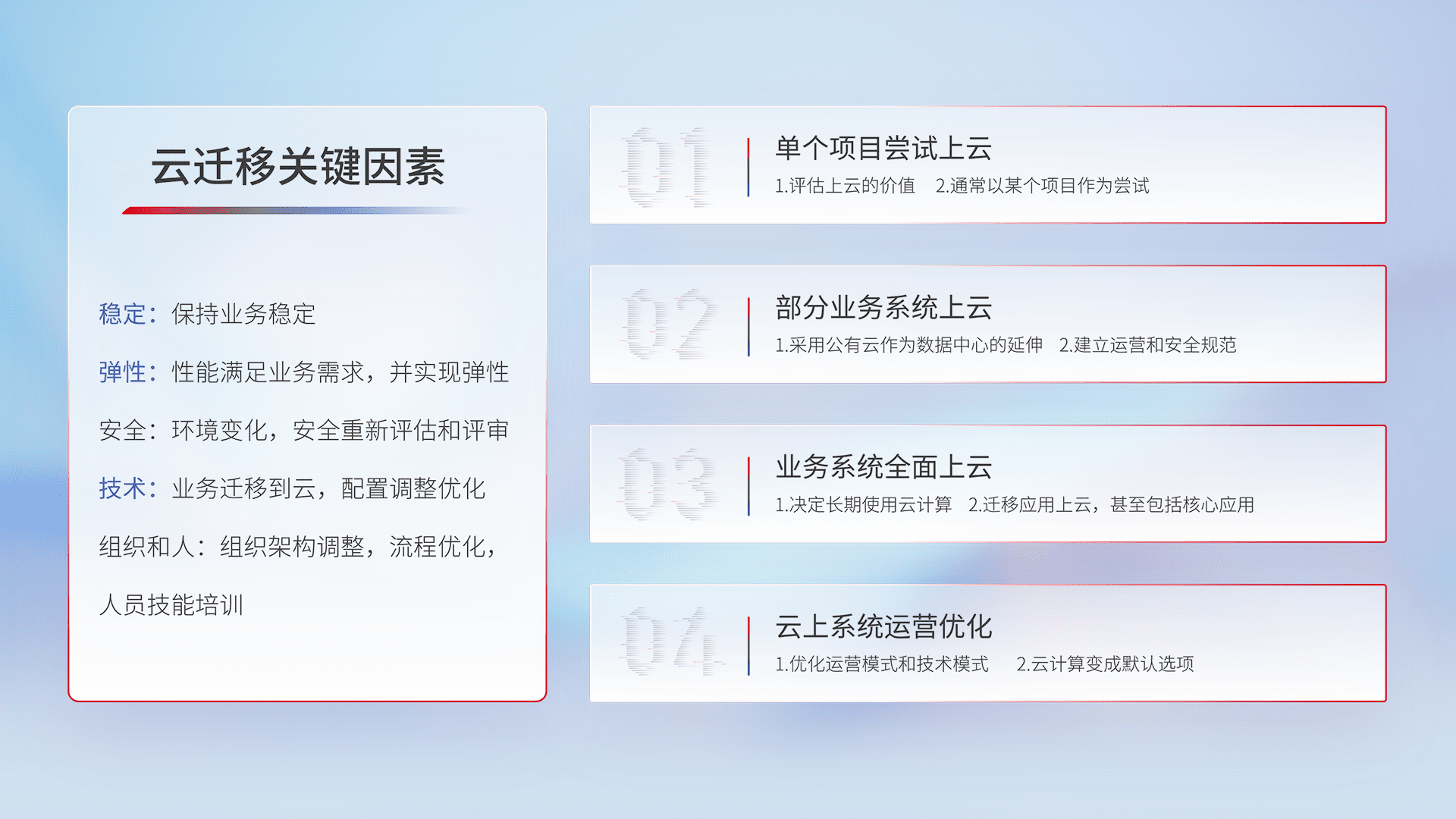 结合实际业务,,,,从规划设计、、云平台选型、、云原生改造、、、、数据迁移、、、集成交付,,迁移全过程为客户识别最佳上云路径,,做好风险识别管理,,,,设计网络架构、、、、身份权限、、、安全审计合规、、、、操作审计、、、日志审计、、、监控告警策略、、、多站点容灾设计等,,,,对云上基础设施进行整体规划,,,提升IT治理水平,,以满足弹性、、、高可用、、、、高性能的需求。。