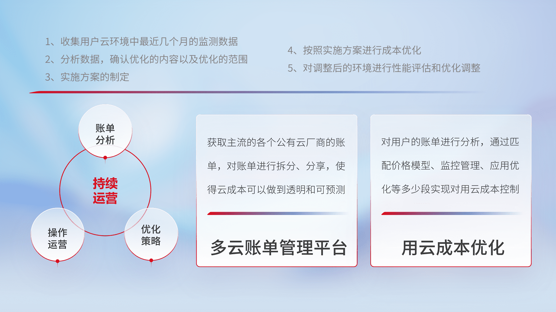 通过多云纳管,,以统一的资源数据模型把客户的云资源进行抽象和封装,,,,进而实现对多云资源的统一操作,,,保障云资源管理的可靠性、、稳定性与可用性。。。量身定制化运维内容,,,,配置、、、、开发运维、、、补丁管理、、、备份、、、、监控、、、认证和访问管理、、审计和日常巡检等,,,,保障在用云过程中的可靠度,,,,稳定度以及高可用率。。。