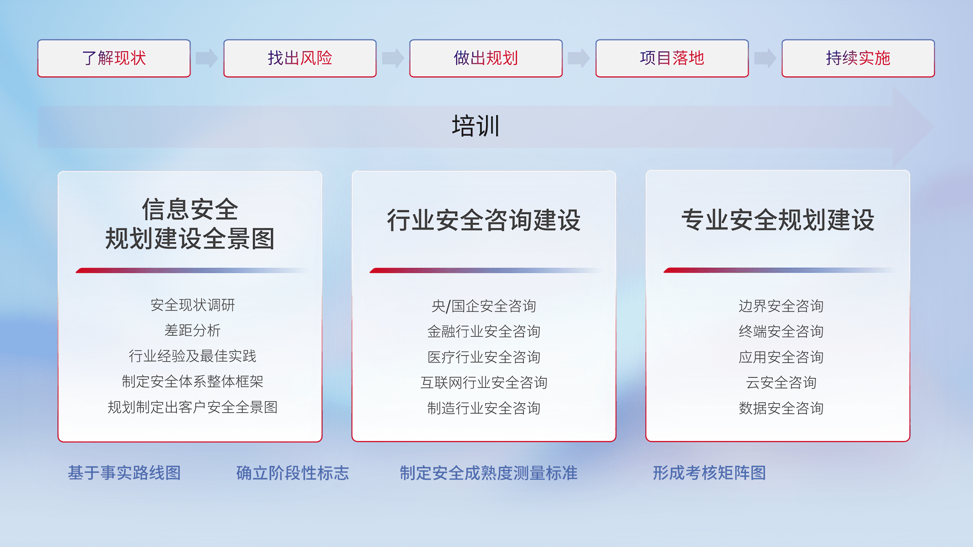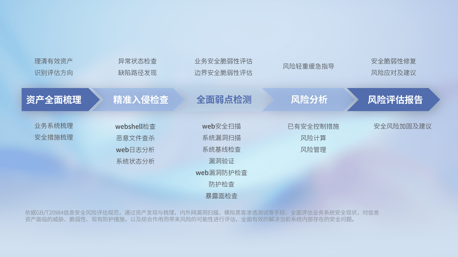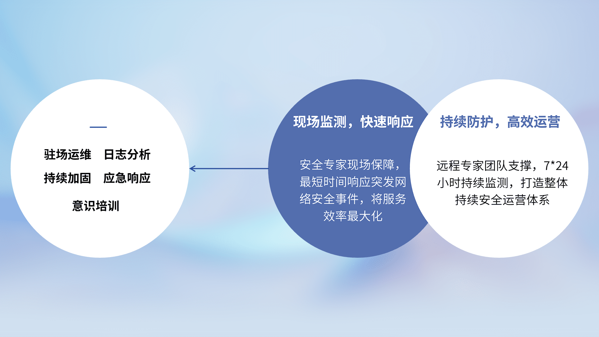 针对客户行业特性,,以专业的安全服务+多厂商联合解决方案提供专属的一站式安全管理服务,,,,帮助客户全面感知网络空间威胁,,基于识别、、、、检测、、、、分析、、、防护、、监测、、、响应的服务理论模型,,,从方案咨询、、集成交付、、、评估验证、、、优化加固、、运维运营,,,致力于为客户提供完整的闭环管理式安全服务。。。。以实战经验为客户打造高抵御风险的安全体系,,帮助客户发现威胁、、对抗威胁、、、、处置威胁,,,不断积累安全对抗能力,,持续保障数字化安全。。。